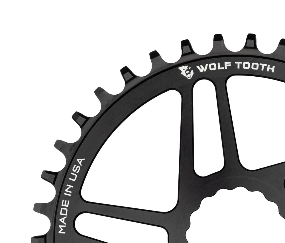 Das patentierte Drop Stop B Narrow-Wide-Zahnprofil von Wolf Tooth bietet die ultimative Kettenfuehrung und Selbstreinigung. Die rechte Seite des Zahns ist so breit wie moeglich, um die Kontaktflaeche zur Kette zu maximieren. Mehr Kontaktflaeche bedeutet, dass die Belastung auf einer groesseren Flaeche verteilt wird, was wiederum den Verschleiss reduziert. Die linke Seite des Zahns ist schmaler als der Rollenstift der Kette, darum hat Wolf Tooth zusaetzliches Material entfernt, um einen Kanal zu schaffen damit Schmutz abfliessen kann. Mehr Kontaktflaeche und Platz bedeutet wiederum eine geringere Wahrscheinlichkeit das die Kette beim fahren durch Schmutz herunterfaellt.